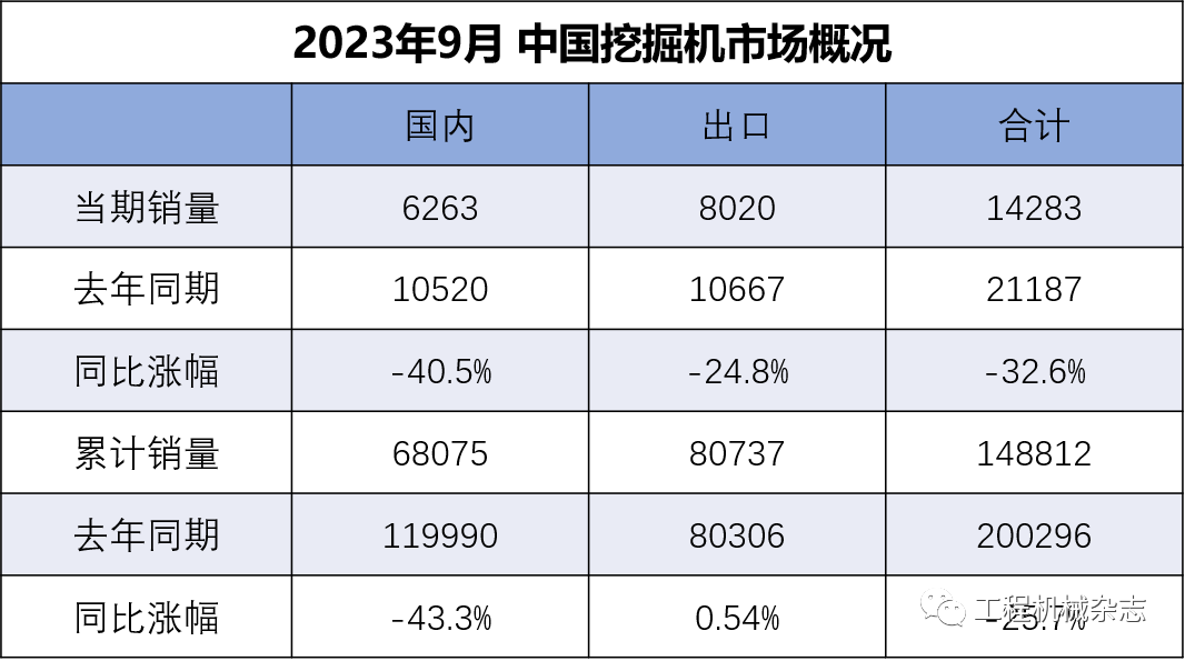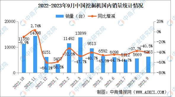 据中国工程机械工业协会对挖掘机主要制造企业统计,2023年9月销售各类挖掘机14283台,同比下降32.6%,其中国内6263台,同比下降40.5%;出口8020台,同比下降24.8%。2023年1-9月,共销售挖掘机148812台,同比下降25.7%…......
