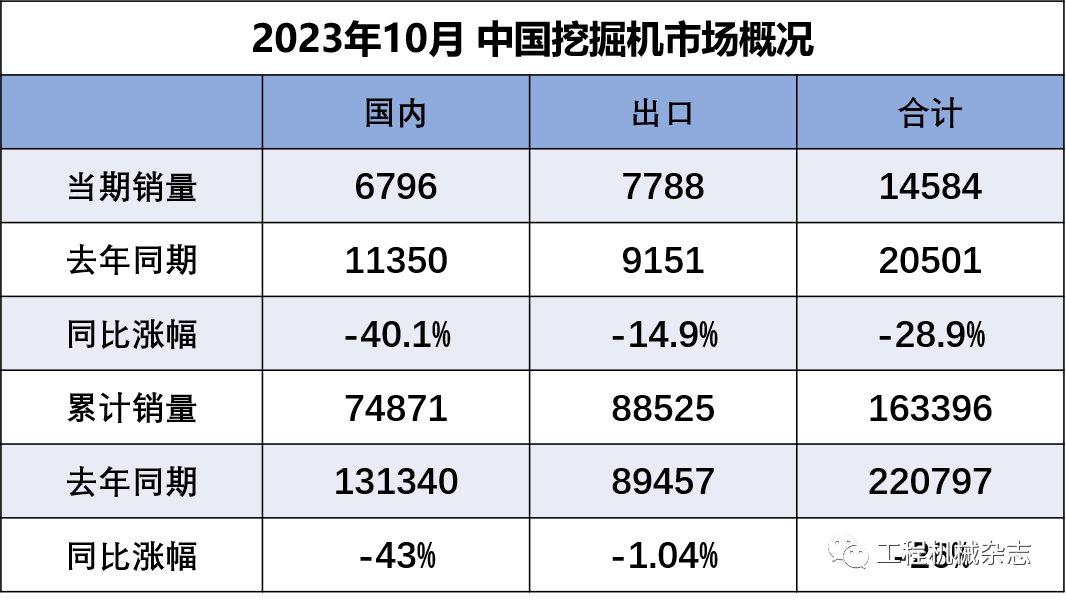 据中国工程机械工业协会对挖掘机主要制造企业统计,2023年10月销售各类挖掘机14584台,同比下降28.9%,其中国内6796台,同比下降40.1%;出口7788台,同比下降14.9%。2023年1-10月,共销售挖掘机163396台,同比下降26%…......