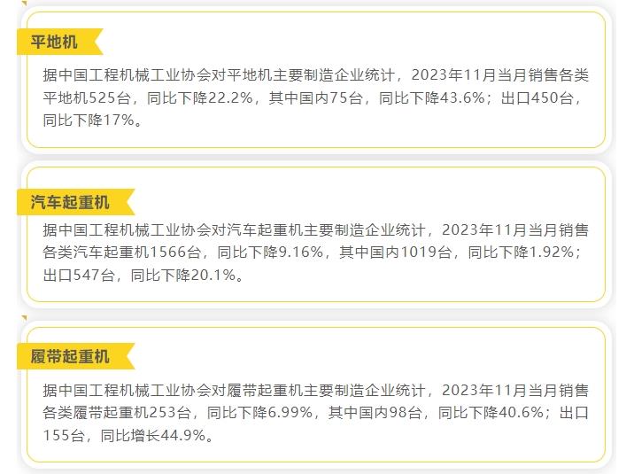 据中国工程机械工业协会对挖掘机主要制造企业统计,2023年11月销售各类挖掘机14924台,同比下降37%,其中国内7484台,同比下降48%;出口7440台,同比下降19.8%。2023年1-11月,共销售挖掘机178320台,同比下降27.1%;…......