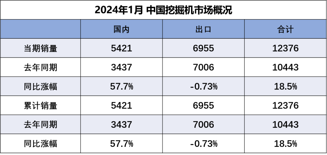 据中国工程机械工业协会对挖掘机主要制造企业统计,2024年1月销售各类挖掘机12376台,同比增长18.5%,其中国内5421台,同比增长57.7%;出口6955台,同比下降0.73%。2024年1月销售电动挖掘机12台(6吨级以下1台,18.5至…......