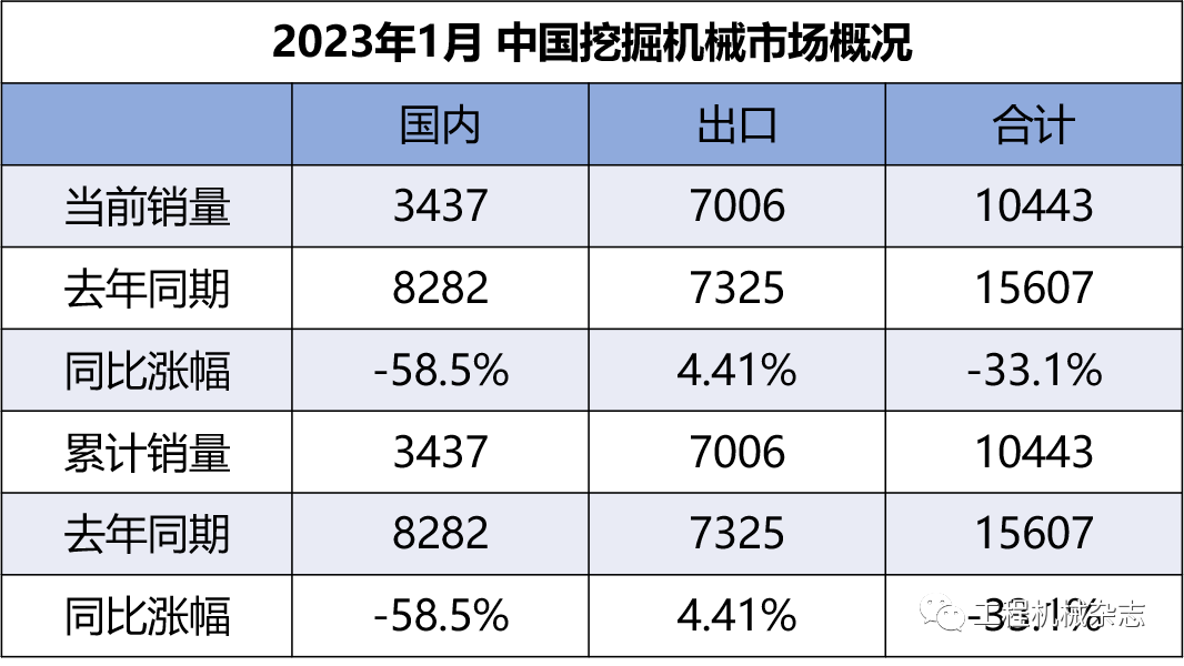 据中国工程机械工业协会对26家挖掘机制造企业统计,2023年1月销售各类挖掘机10443台,同比下降33.1%,其中国内3437台,同比下降58.5%;出口7006台,同比下降4.41%。[数据来源:中国工程机械工业协会]......